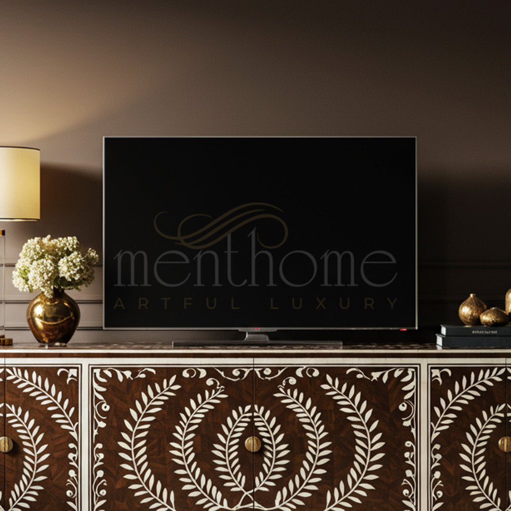 This exquisite TV cabinet features intricate leaf-patterned inlay work on rich, dark wood, adding a touch of artisan luxury to any living room. Designed to elegantly house your television and media accessories, it seamlessly blends craftsmanship with functionality.