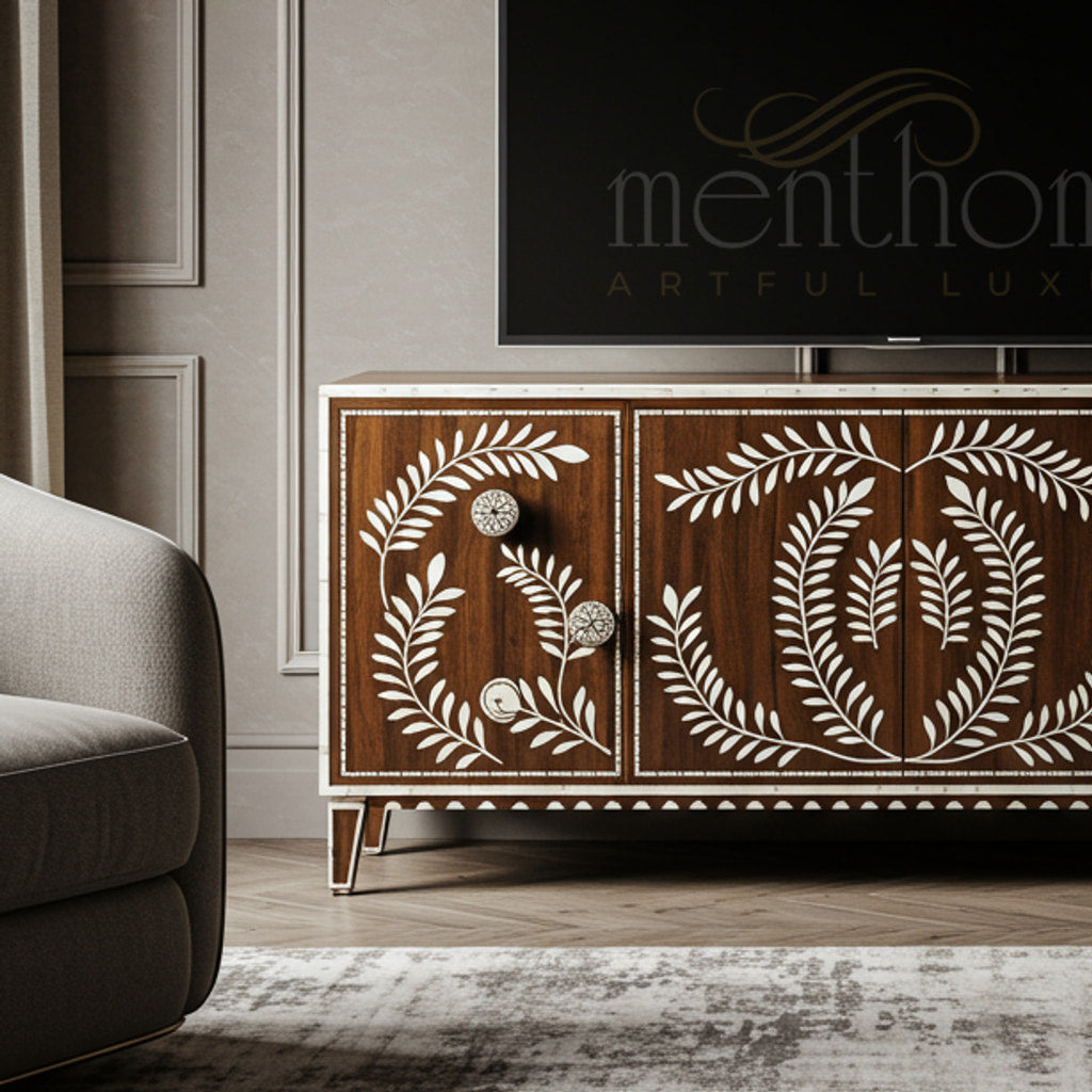 Artisanal Inlay TV Cabinet with Botanical Motif | Luxury Handmade TV Cabinet