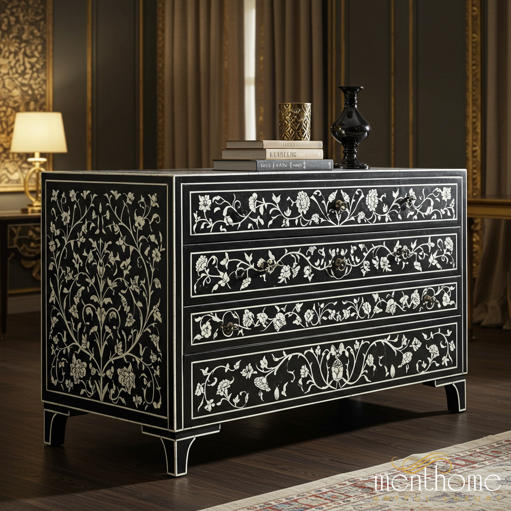 Black Floral Inlay Wooden Chest of Drawers | Luxury Handmade Dresser