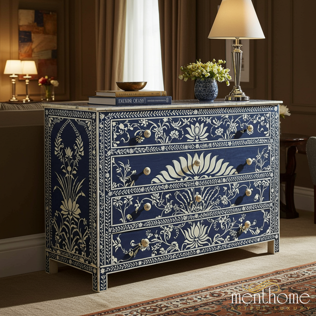 Elegant blue chest of drawers featuring intricate white floral inlay designs. This piece combines traditional craftsmanship with practical storage, perfect for adding a touch of sophistication to your living space.