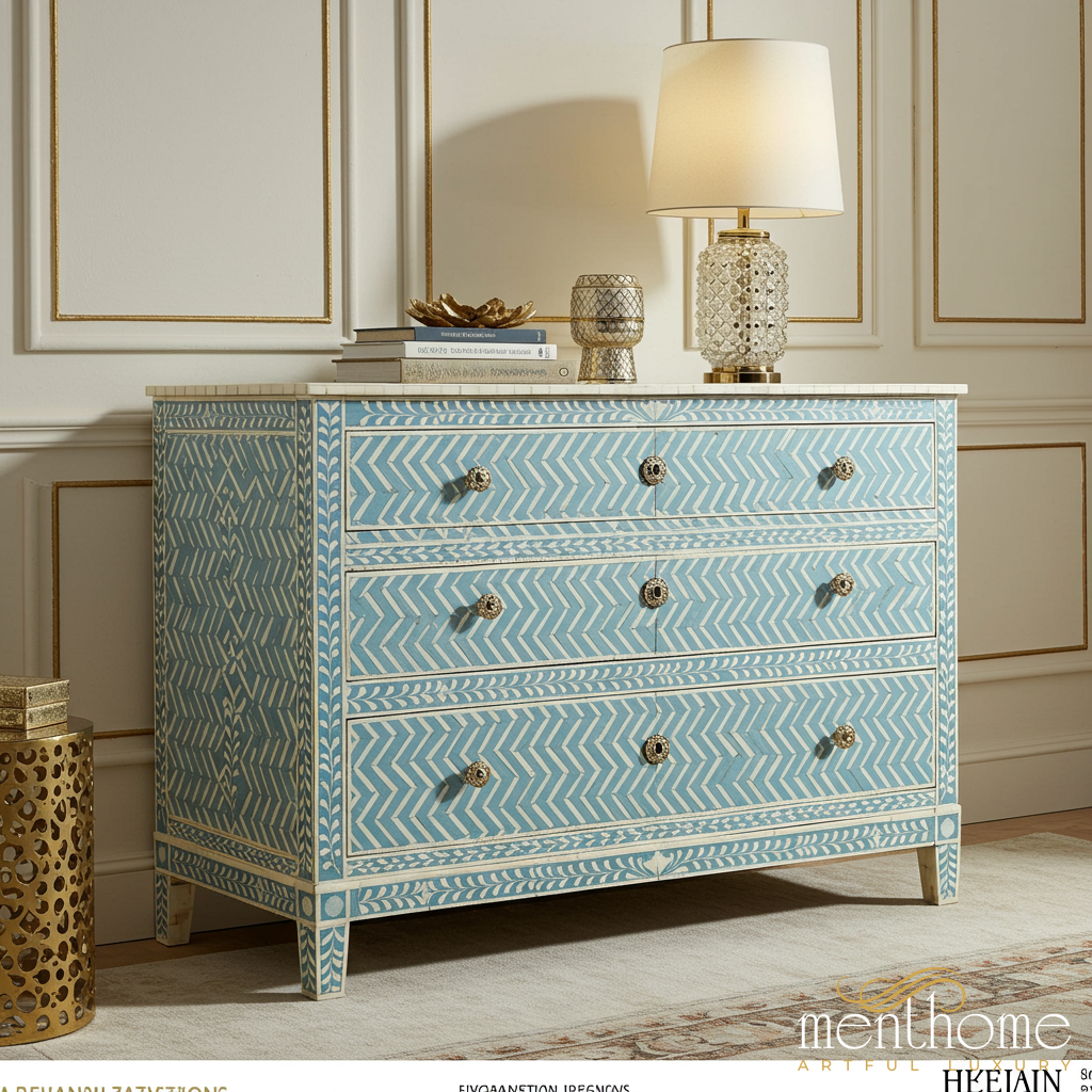 Blue and White Patterned Three-Drawer Dresser | Luxury Handmade Dresser