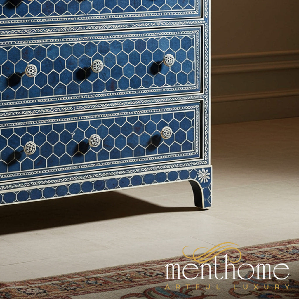 Elegant and intricately designed chest of drawers featuring blue bone inlay work with a geometric pattern. This piece combines traditional craftsmanship with functional storage, making it a stunning addition to any room.