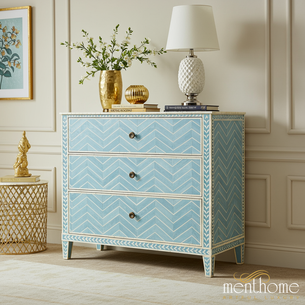 A stylish and functional 3-drawer chest featuring a blue chevron pattern with white accents. Perfect for adding a touch of elegance and organized storage to any bedroom or living space.