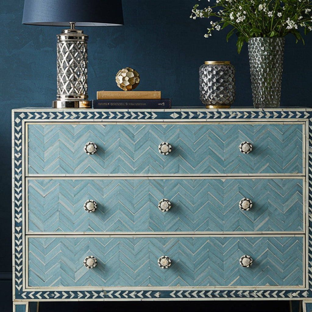 A stylish and elegant chest of drawers featuring a blue chevron pattern with decorative white accents. This piece provides ample storage with three spacious drawers, perfect for organizing clothes or household items. The intricate inlay design makes it a standout addition to any living room, bedroom, or hallway.