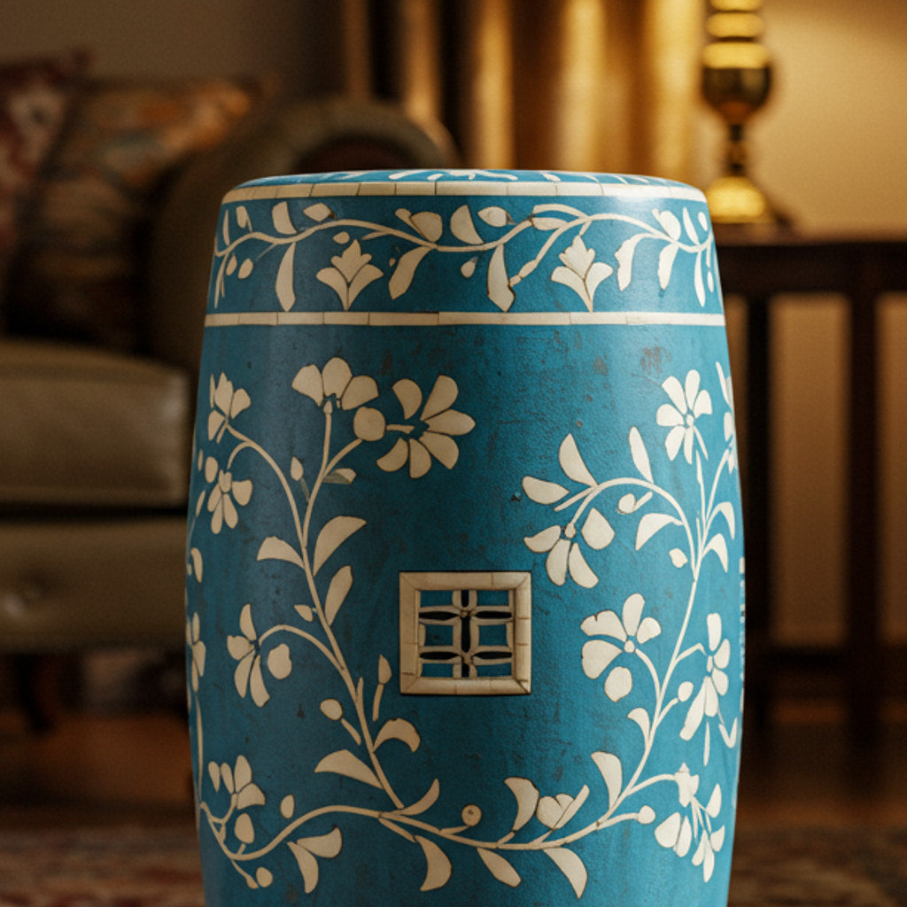 A beautifully crafted blue bone/mother-of-pearl inlay garden stool featuring intricate white floral designs. Perfect as a decorative piece for both indoor and outdoor spaces, this stool blends traditional style with versatile functionality.