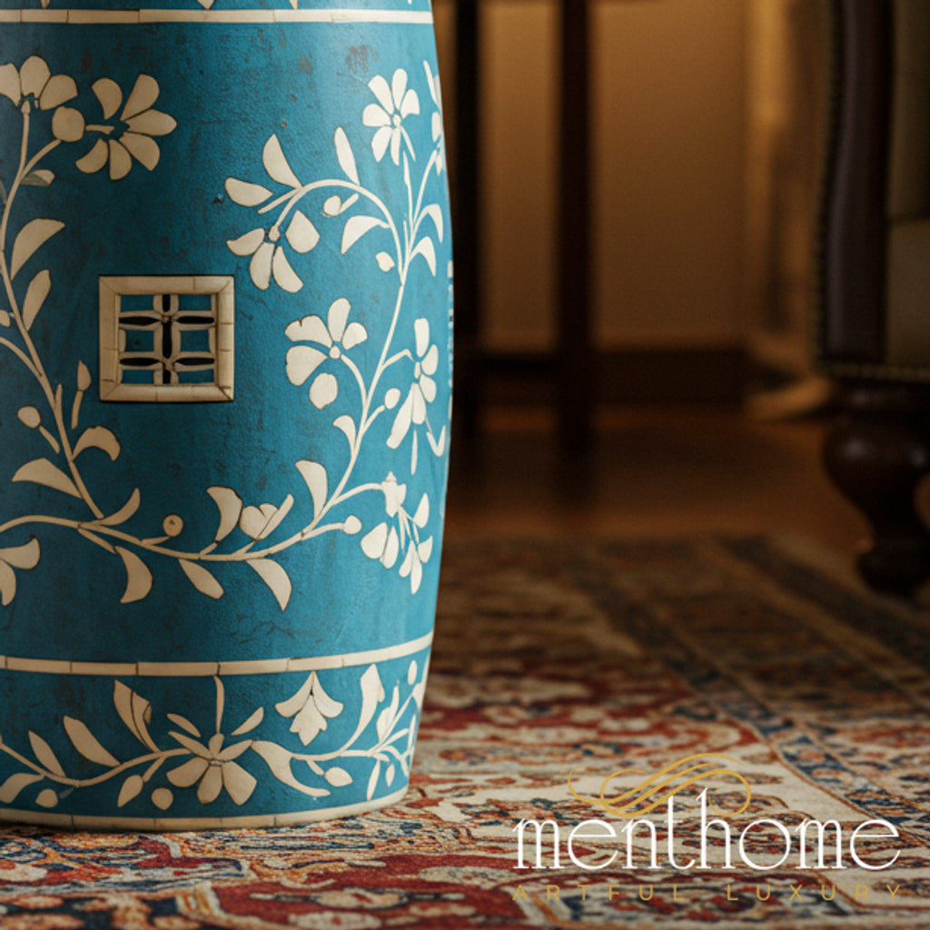 Blue Floral inlay Garden Stool | Luxury Handmade Stool