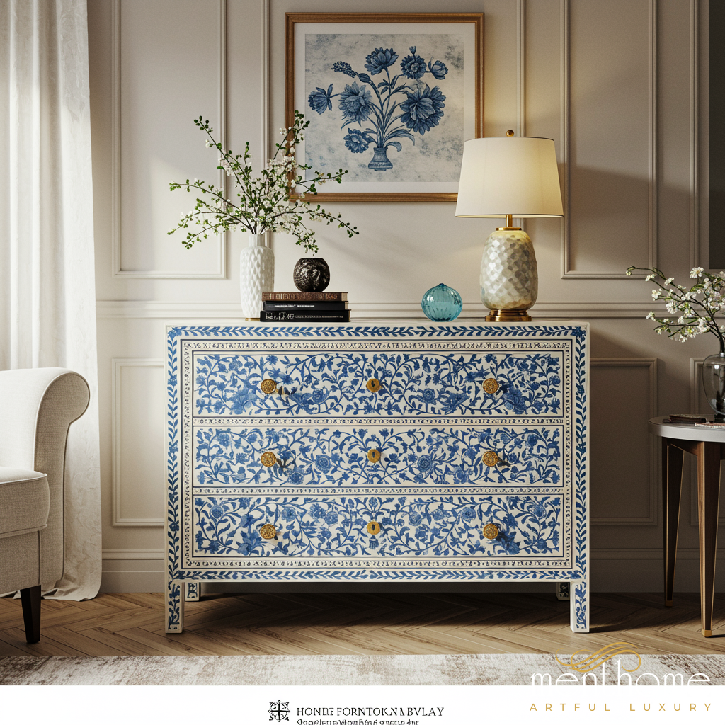 This elegant wooden chest of drawers features a hand-painted blue floral design on a white background, adding a touch of classic charm to any living space. It includes three spacious drawers with ornate golden knobs, perfect for storing clothing, accessories, or household items. The piece combines artistic craftsmanship with practical storage solutions, making it ideal for bedrooms, living rooms, or entryways.