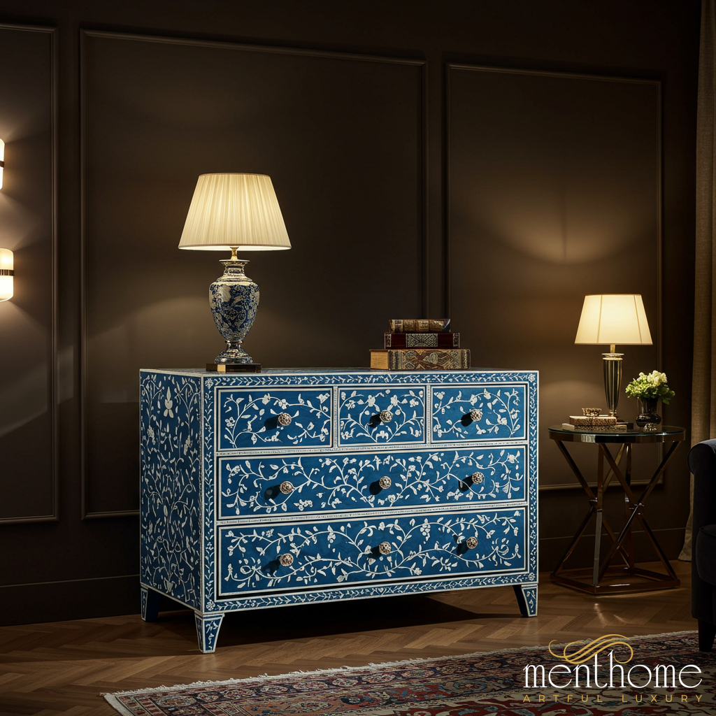 Blue Floral Inlay Wooden Chest of Drawers | Luxury Handmade Dresser