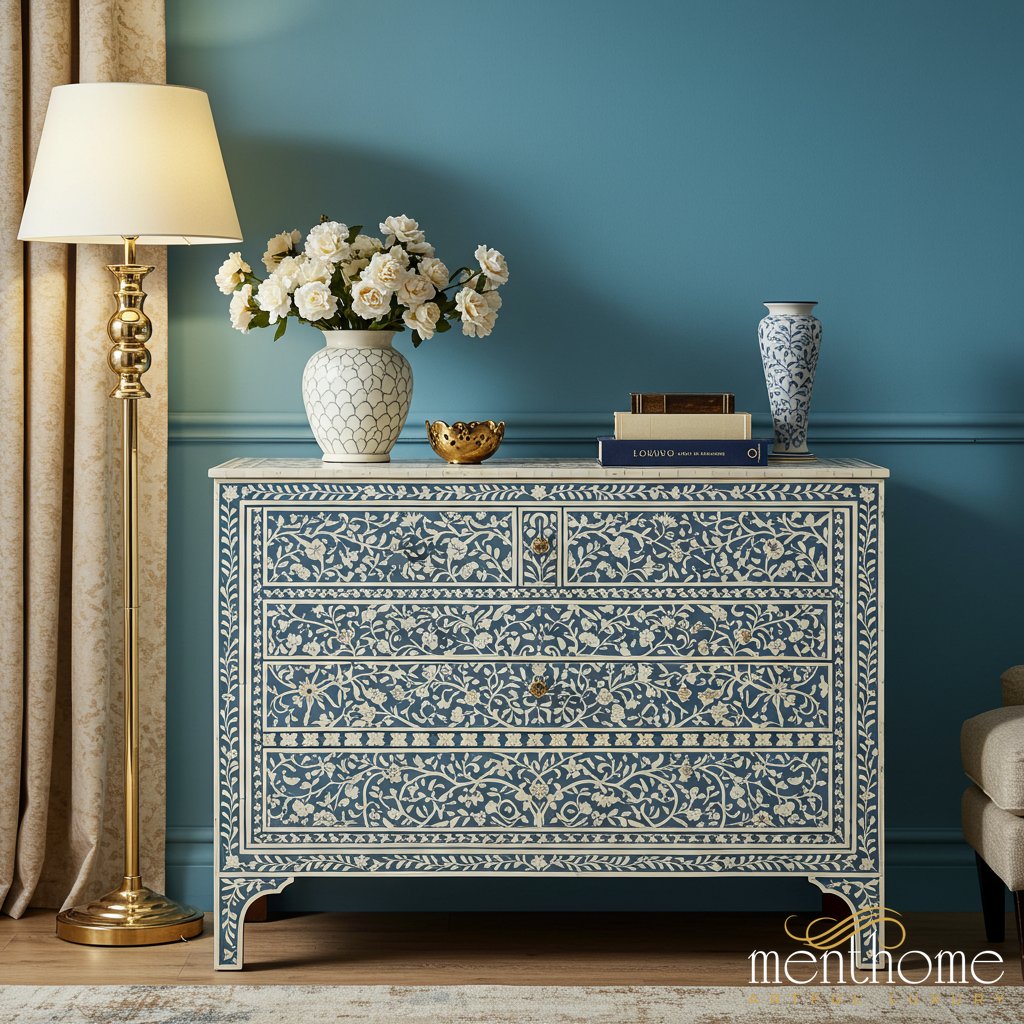 Elegant and intricately designed blue wooden chest of drawers featuring delicate white floral inlay patterns. This piece combines classic artistry with functional storage, perfect for enhancing the aesthetics of any living space.