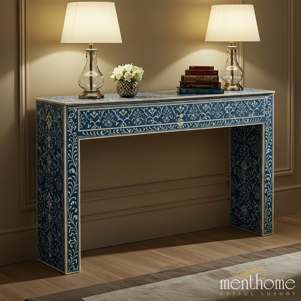An elegant blue console table featuring intricate floral patterns and a classic design, perfect for enhancing the aesthetic of any hallway or living space.