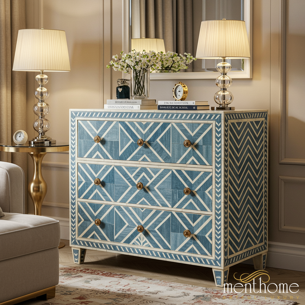 A stylish and functional chest of drawers featuring a blue geometric pattern with three spacious drawers. Perfect for adding a touch of elegance and organization to any living room or bedroom.