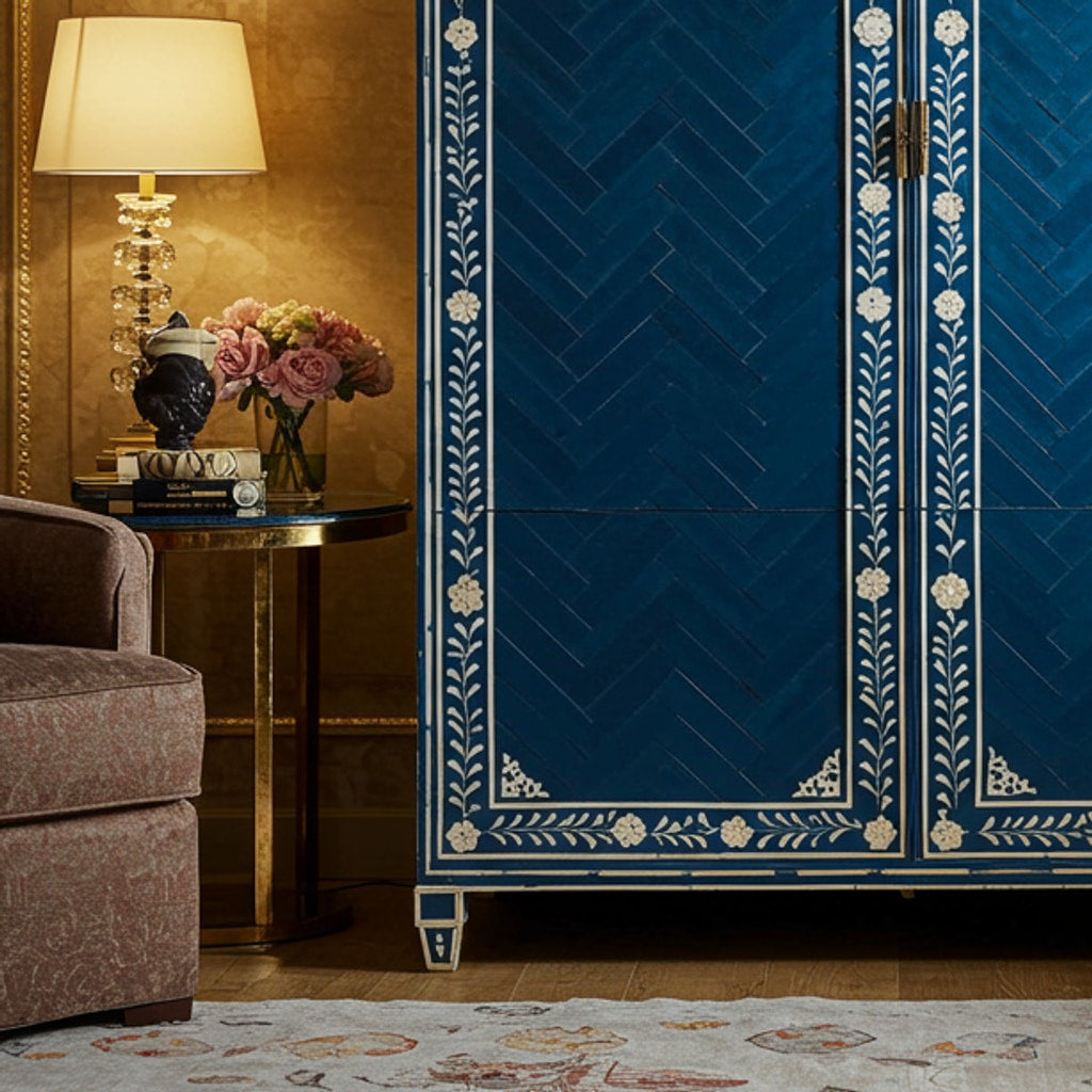Blue Inlaid Double Door Wardrobe with Floral Detailing | Luxury Handmade Wardrobe