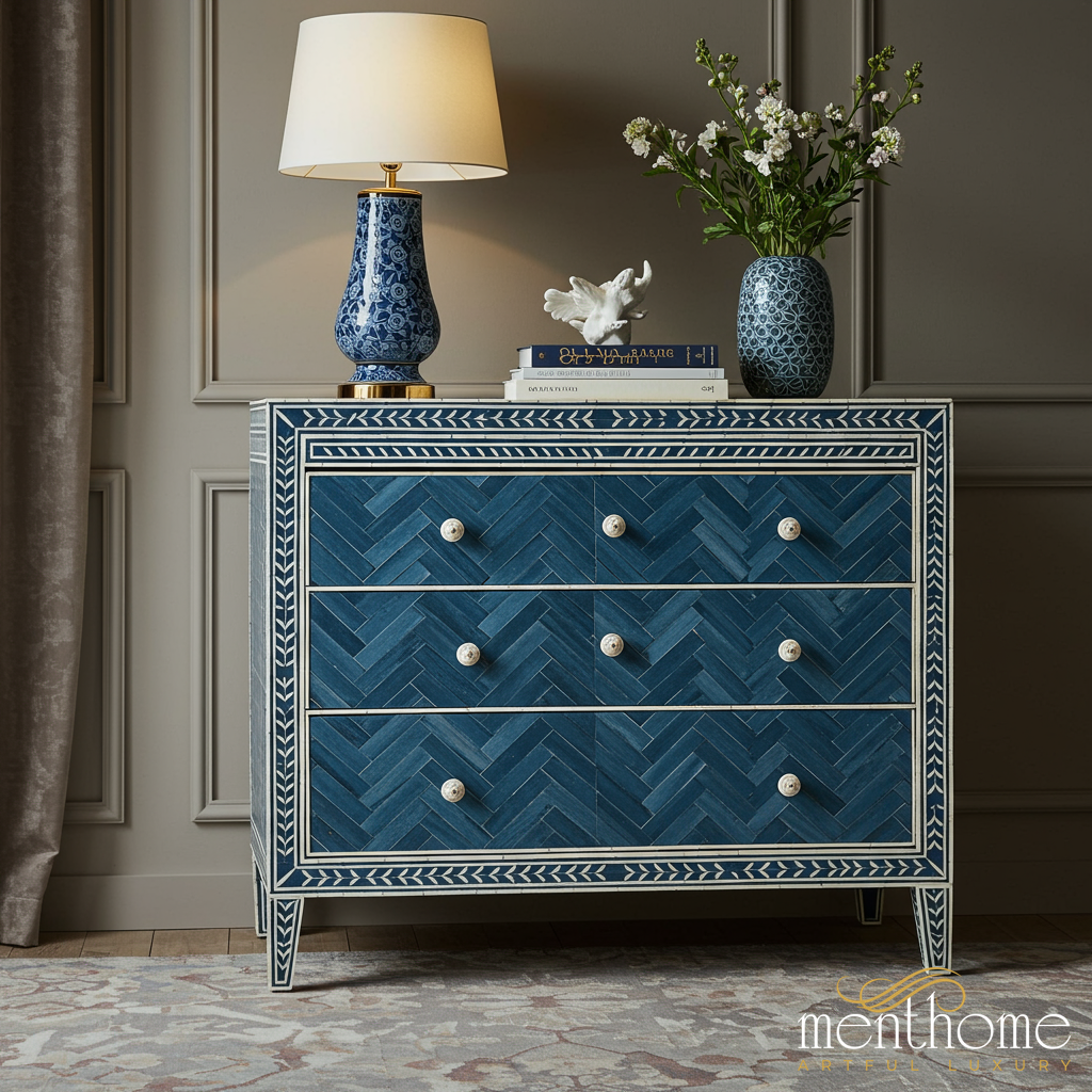 Elegant blue inlay chest featuring three spacious drawers with intricate herringbone pattern and decorative border. Perfect for adding a unique touch to your bedroom or living area.