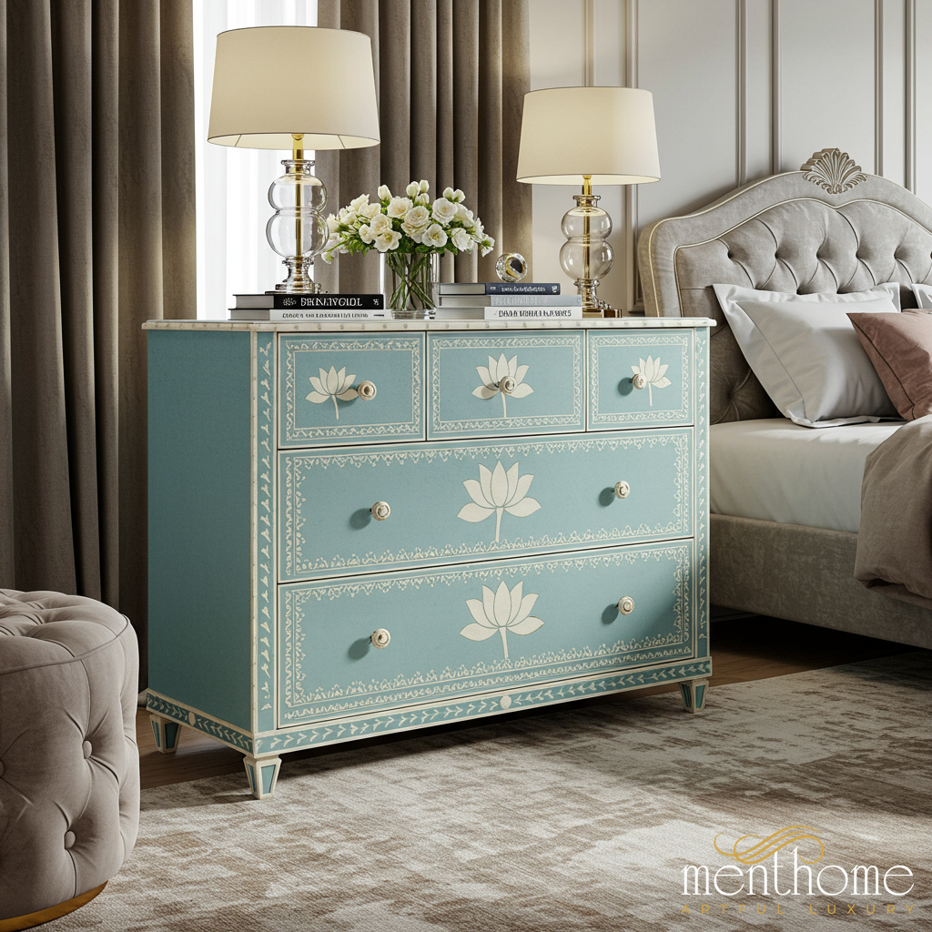 Blue Lotus Hand-Painted Wooden Chest of Drawers | Luxury Handmade Dresser