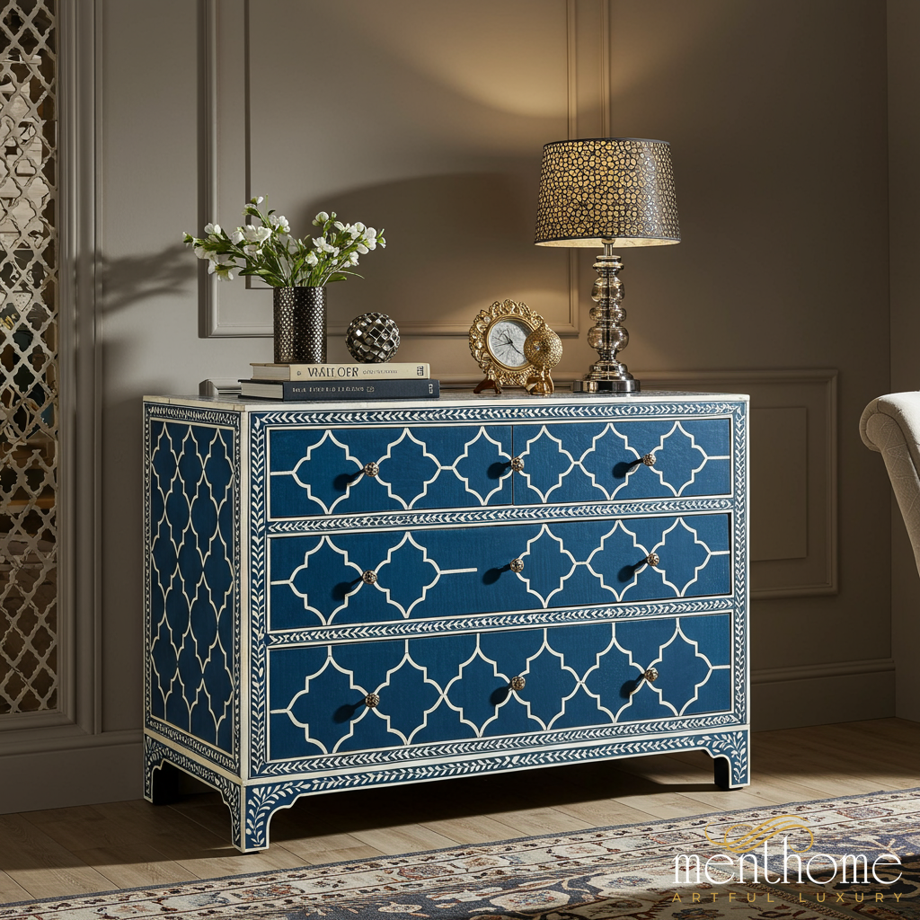 This elegant blue chest of drawers features a beautiful Moroccan-inspired geometric pattern, perfect for adding a touch of sophistication to any room. Crafted with intricate inlay detailing, this piece combines style and functionality with three spacious drawers for ample storage.