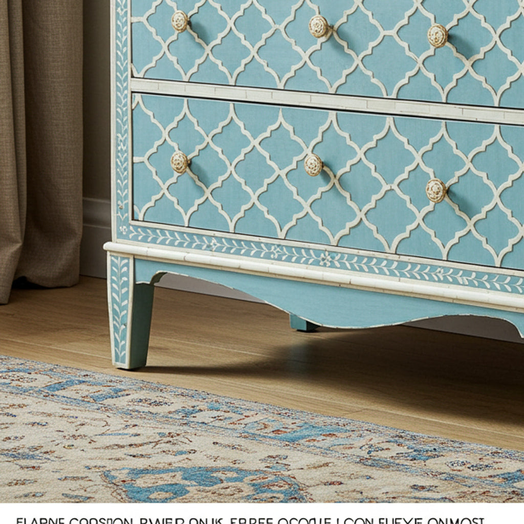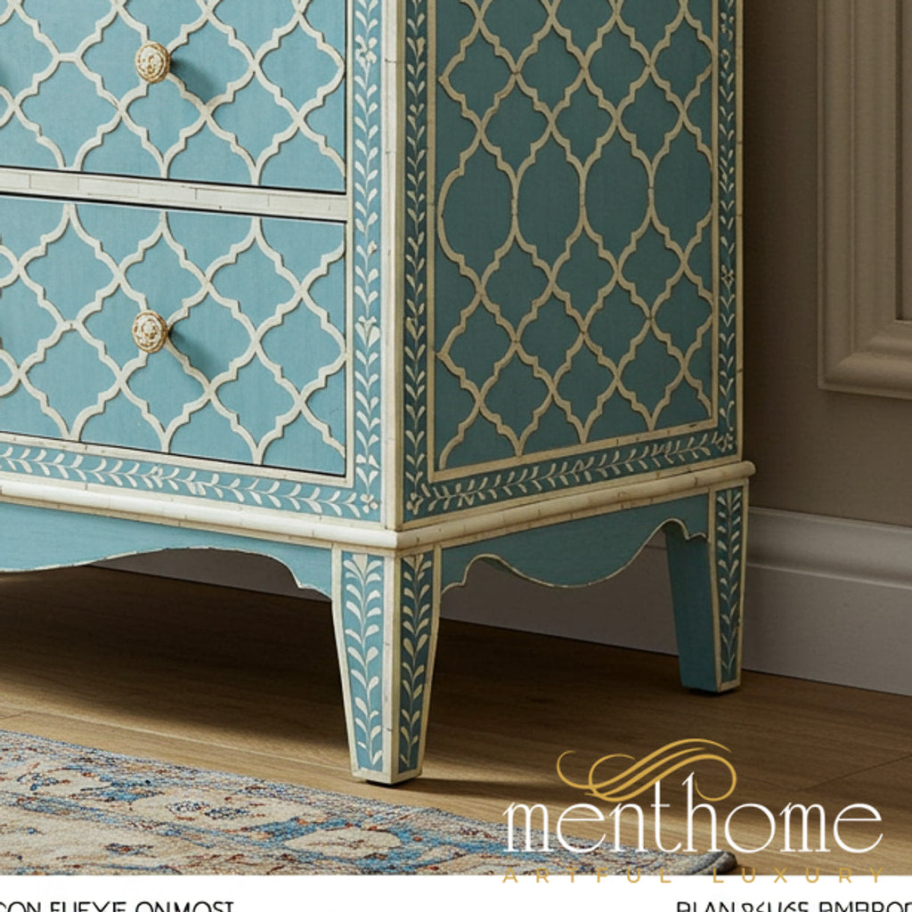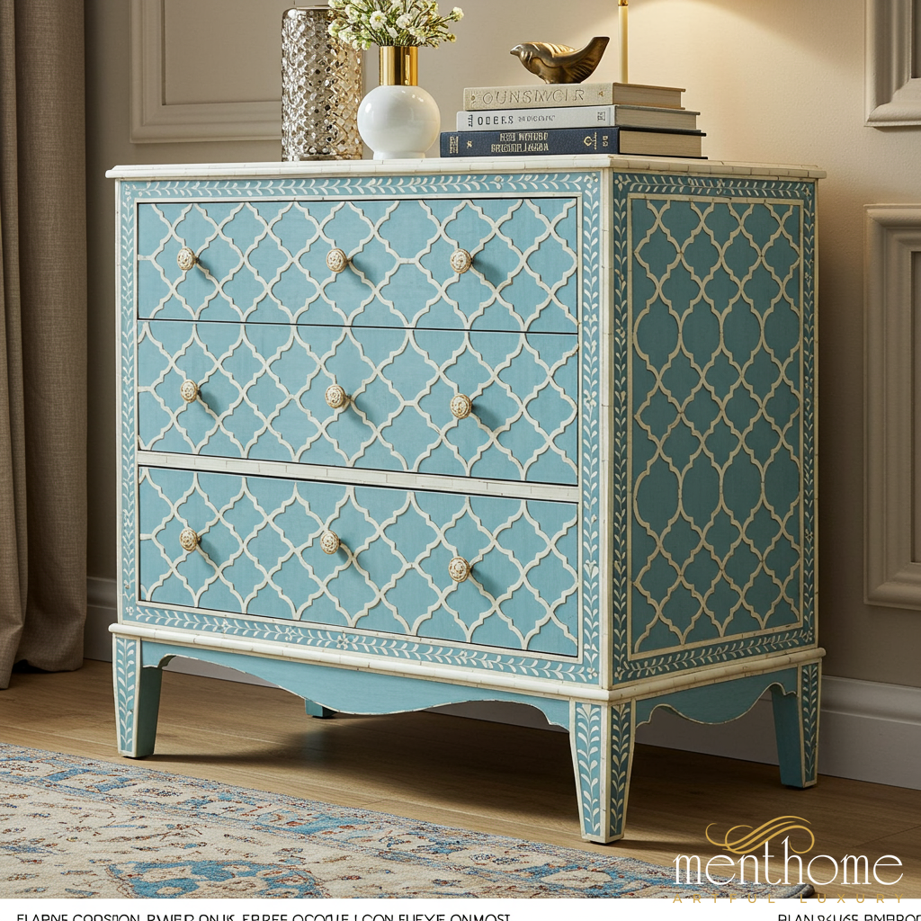 A beautifully crafted chest featuring three spacious drawers adorned with an intricate white geometric pattern against a blue background. The chest is elevated on elegantly designed legs and trimmed with a delicate leaf motif, providing a stylish and functional storage solution.