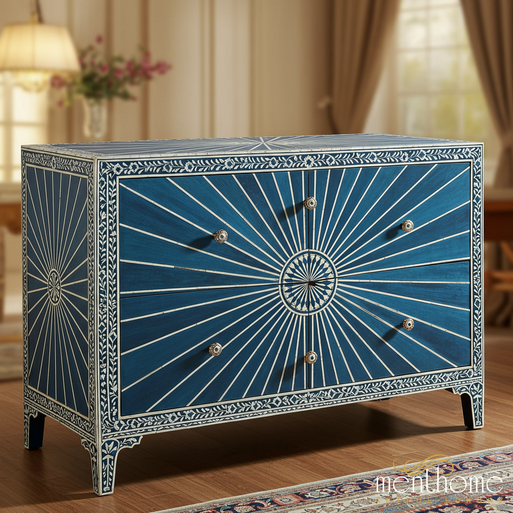A beautifully crafted wooden dresser featuring a striking blue finish with elegant white inlay designs in a sunburst pattern. This piece combines traditional craftsmanship with modern aesthetics, perfect for adding a unique touch to any room.