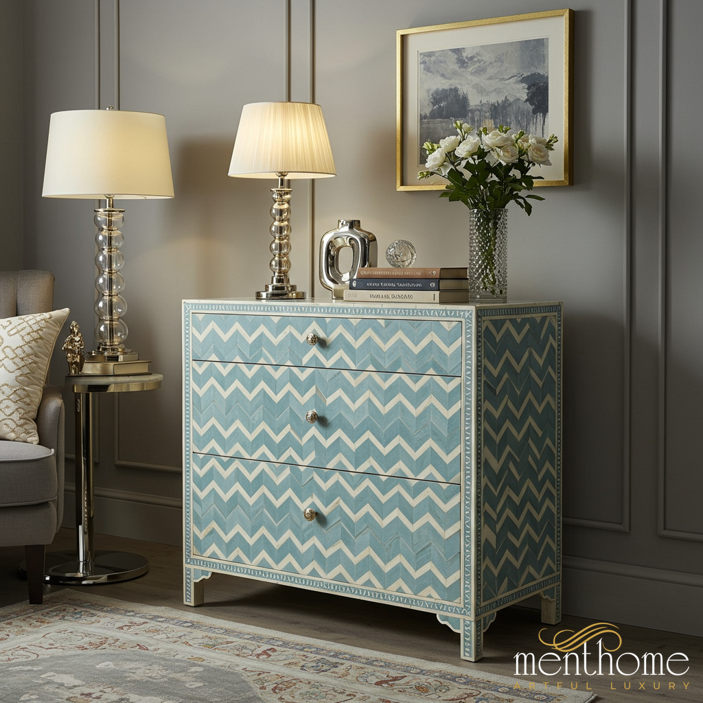 A stylish chest of drawers featuring a blue and white chevron pattern. This elegant piece offers three spacious drawers with decorative knobs, perfect for bedroom or living room storage.