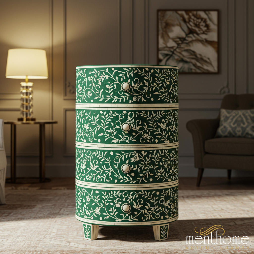 A stylish and compact round chest of drawers featuring an exquisite green background with ivory floral patterns. This furniture piece combines functionality with a unique artistic design, perfect for adding an elegant touch to any living room or bedroom.