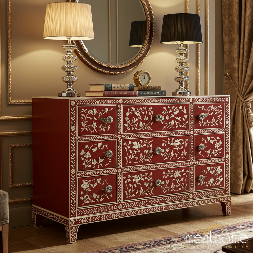 Decorative Red Wooden Dresser with Floral Inlay | Luxury Handmade Dresser