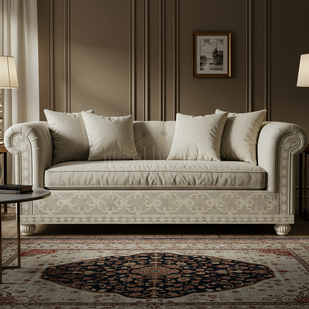 Elegant Beige Inlay Sofa with Plush Cushions | Luxury Handmade Sofa