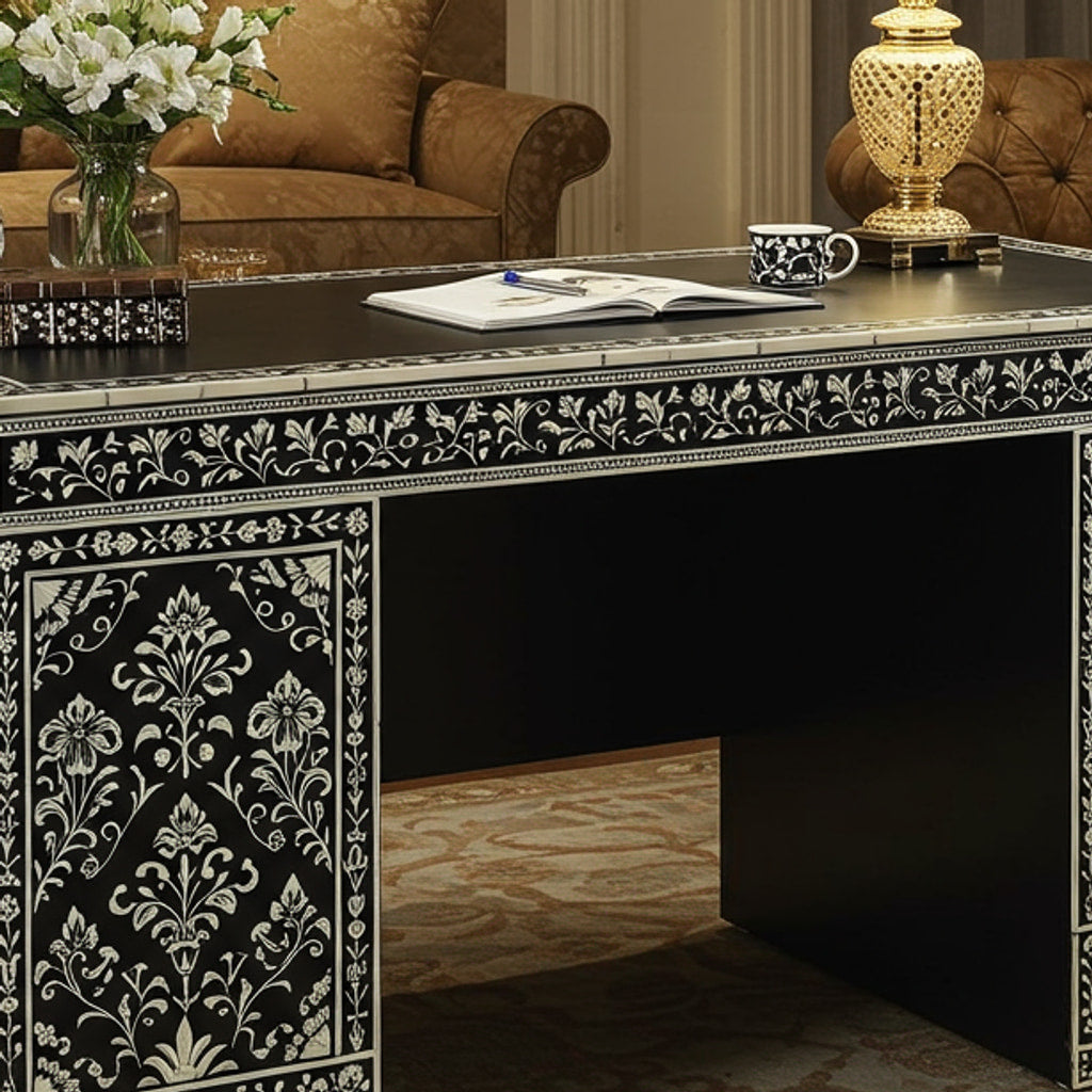 Elegant Black and Silver Floral Patterned Writing Desk | Luxury Handmade Desk