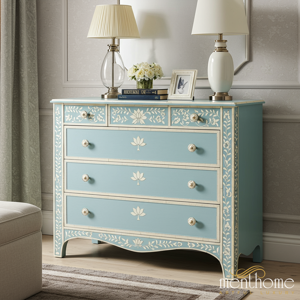 This beautifully crafted chest of drawers features a vintage-inspired design with hand-painted floral details in a soft blue and cream color palette. Its sturdy construction and elegant finish make it perfect for adding both style and storage to any room.