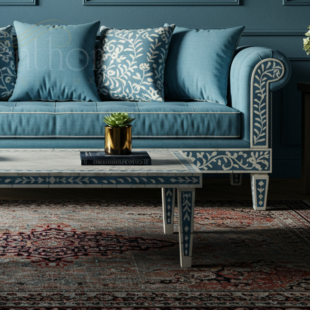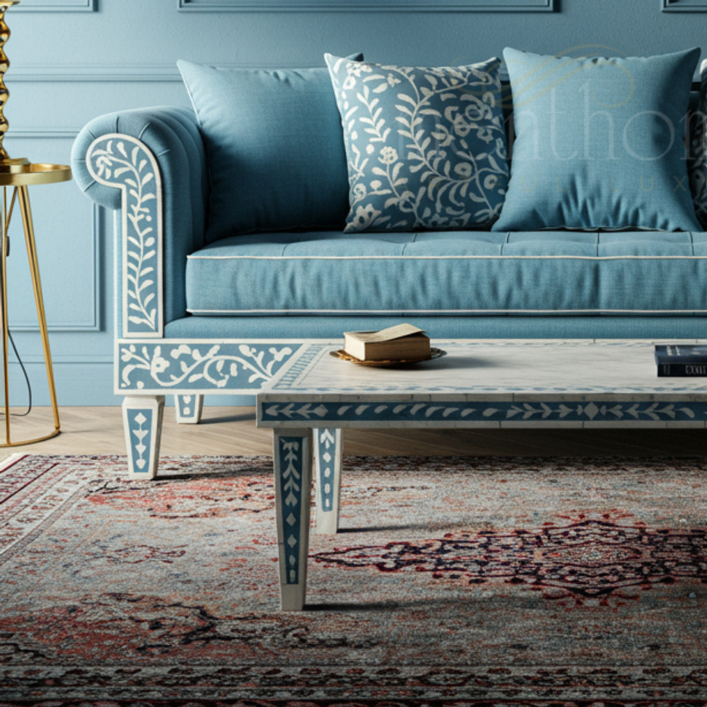Elegant Blue Inlay Sofa with Floral Motif | Luxury Handmade Sofa