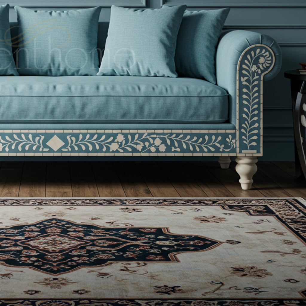 Elegant Blue Inlay Sofa with Floral Motif | Luxury Handmade Sofa