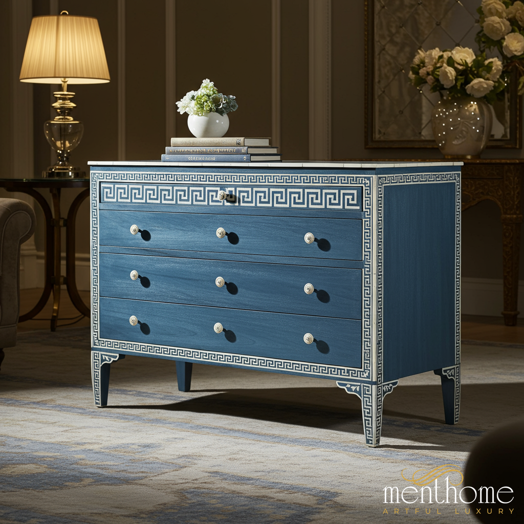 Elegant Blue Wooden Chest of Drawers with Greek Key Pattern | Luxury Handmade Chest of Drawer