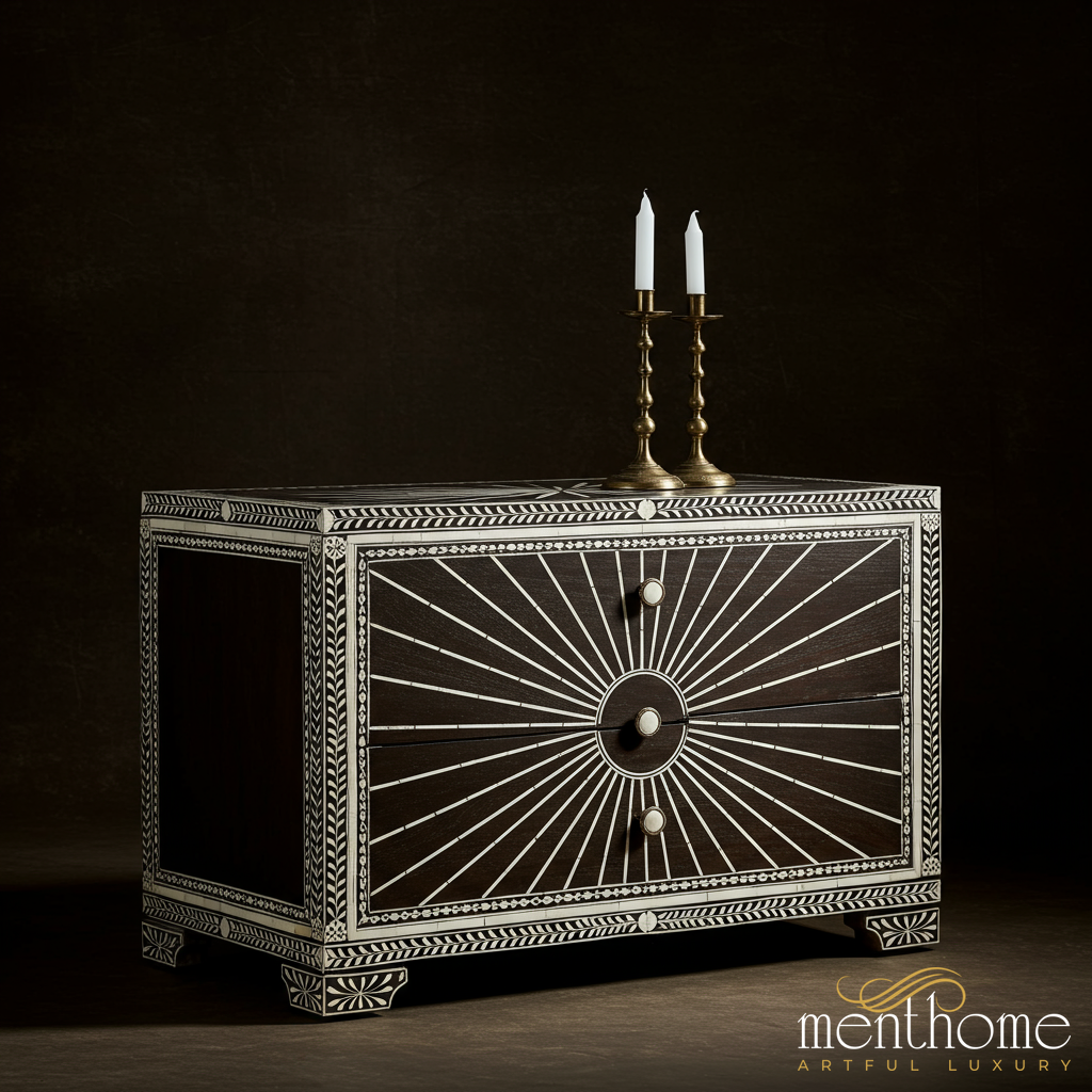 Elegant Dark Wood Chest with White Inlay Design | Luxury Handmade Chest of Drawer