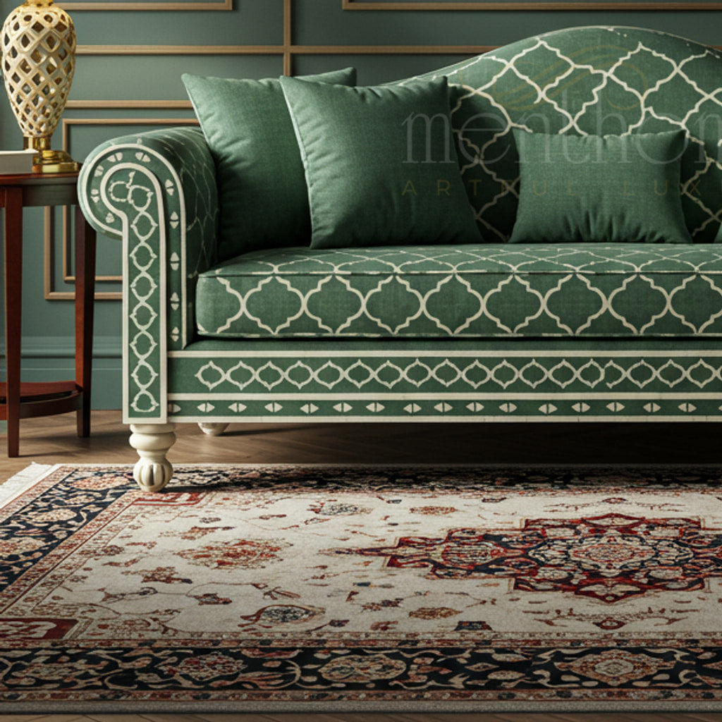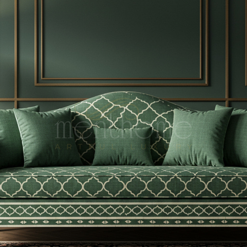 This exquisite green inlay sofa features a classic Moroccan-inspired pattern with intricate white inlay work on the arms, base, and backrest. Its luxurious fabric upholstery is complemented by deep cushioning and multiple matching pillows, offering both comfort and style. Perfect for sophisticated living spaces, this sofa delivers a blend of traditional craftsmanship and modern elegance.