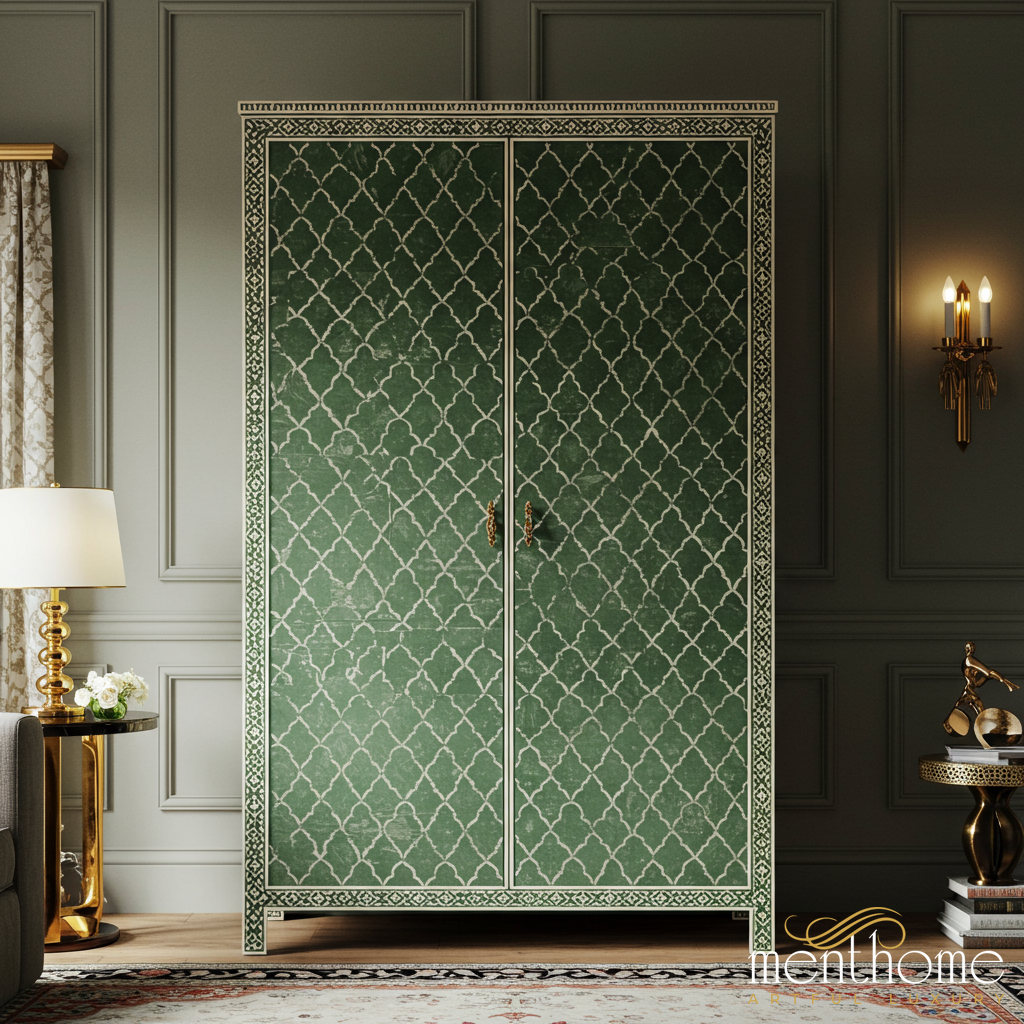 A sophisticated green wardrobe adorned with intricate lattice patterns and decorative borders, perfect for adding a classic touch to any living space. Featuring dual doors with stylish handles, this wardrobe combines functionality with timeless design.