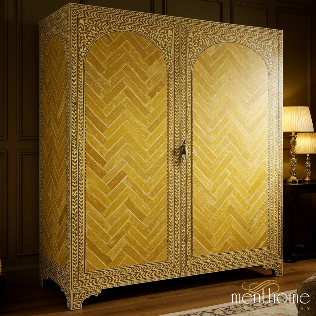 This beautifully handcrafted wardrobe features intricate inlaid designs and a luxurious golden finish. Made with high-quality wood and detailed craftsmanship, it provides ample storage space while adding a sophisticated touch to any bedroom or living space.