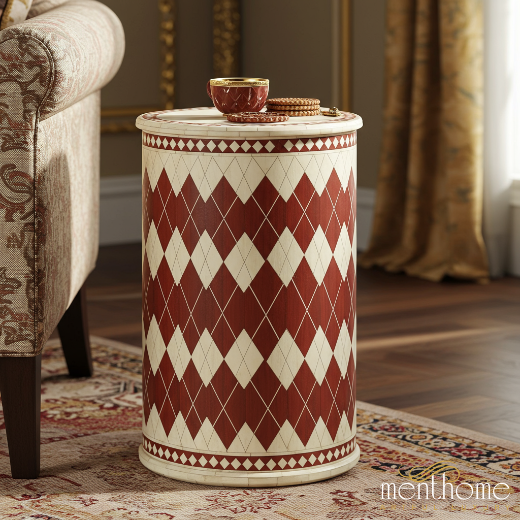 Elegant Harlequin Patterned Drum Table | Luxury Handmade Side Table