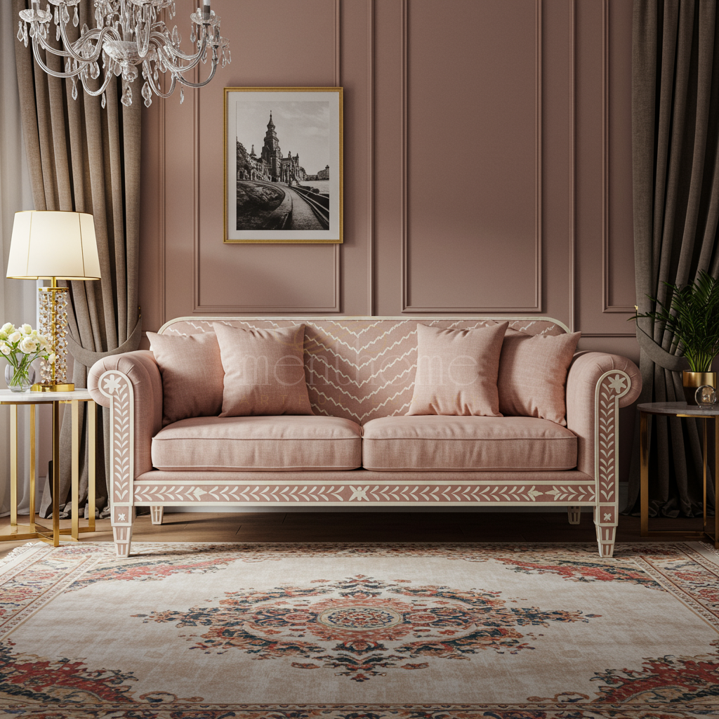 A beautifully crafted inlay sofa with exquisite floral and geometric patterns along the armrests and base, upholstered in a soft blush pink fabric. This sofa blends classic elegance with modern comfort, making it a stunning centerpiece for any living room setting.