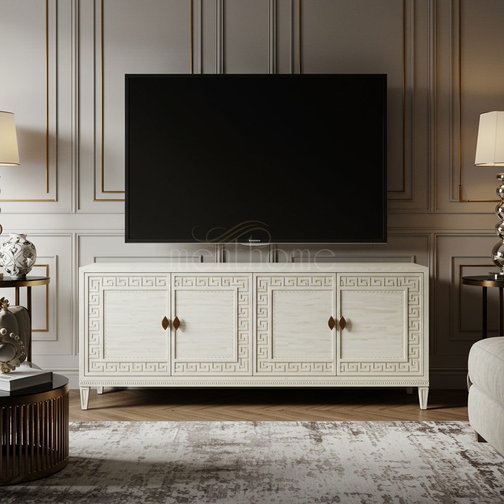 This sophisticated inlay TV cabinet features a classic Greek key motif adorning the doors, expertly crafted in a soft white finish. Designed to blend functionality with refined aesthetics, this cabinet offers spacious storage behind its four doors, with elegant brass handles complementing its timeless appeal. Perfect for those looking to enhance their living space with a combination of luxury and practicality.
