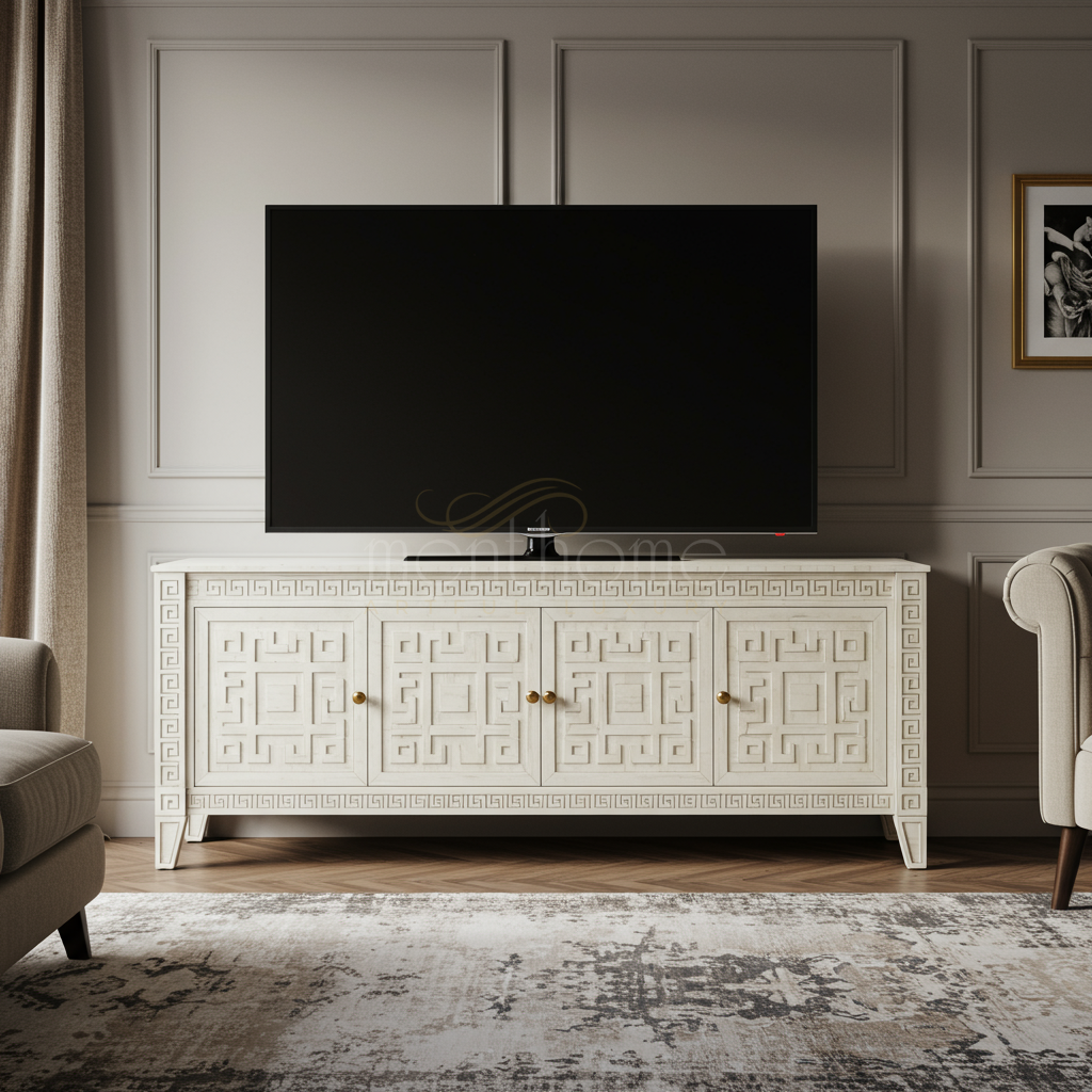 A sophisticated inlay TV cabinet crafted with intricate geometric patterns and a timeless ivory finish. This piece combines classic design elements with functional storage, making it an ideal centerpiece for any luxury living room setup.