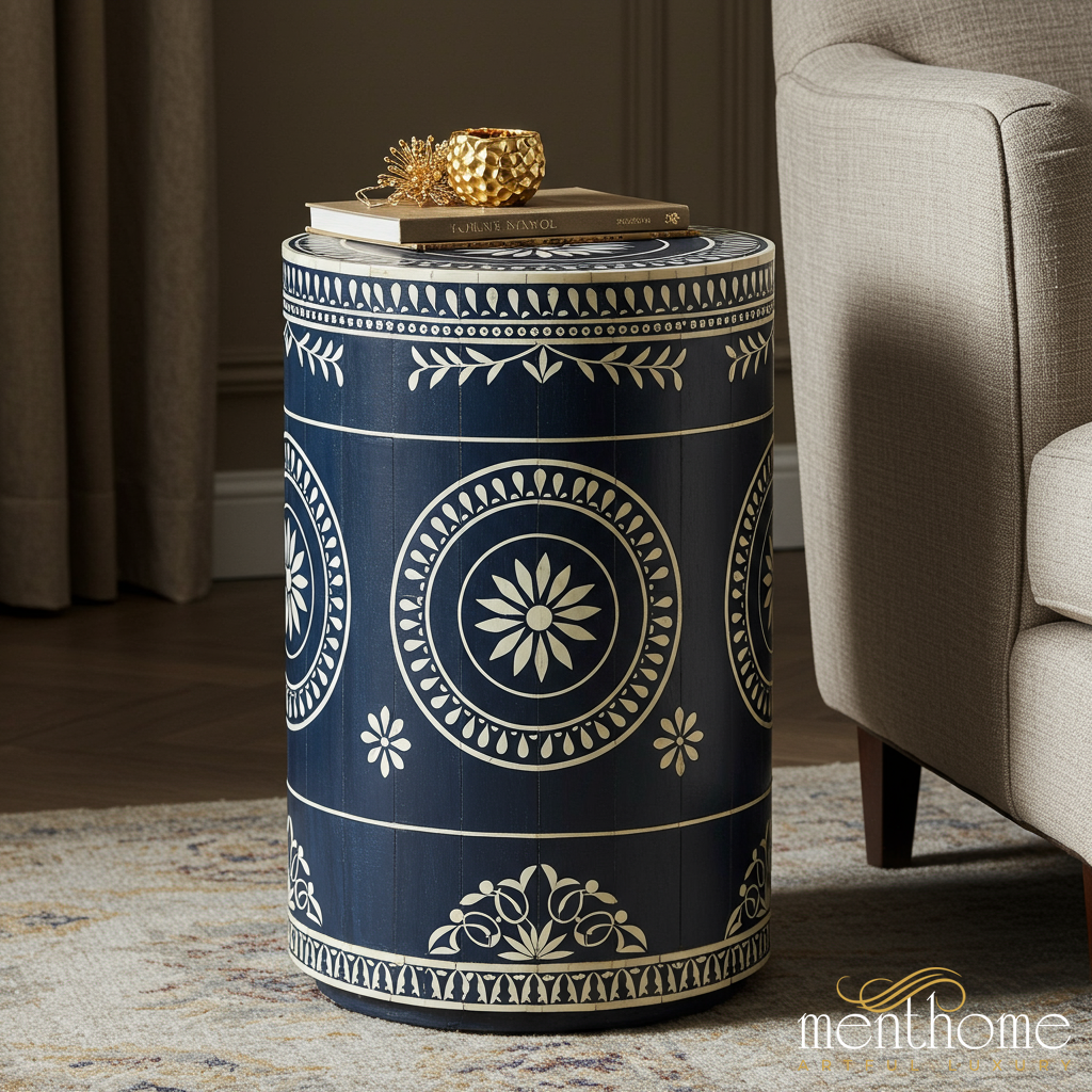 Elegant Navy Blue and Gold Decorative Drum Table | Luxury Handmade Side Table
