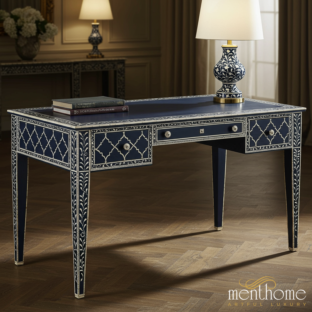 Elegant Navy Blue and White Inlaid Writing Desk | Luxury Handmade Desk