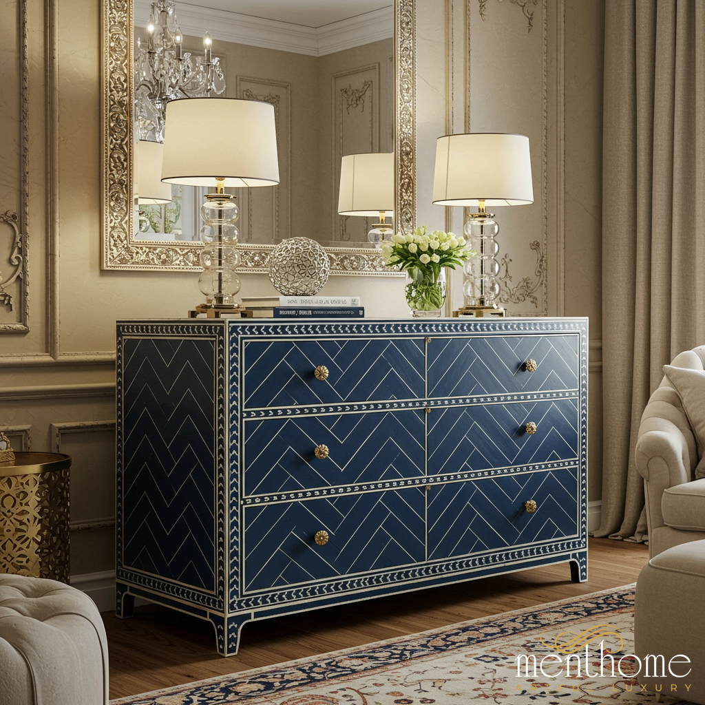 Elegant Navy Blue Chevron Pattern Dresser with Gold Accents | Luxury Handmade Dresser