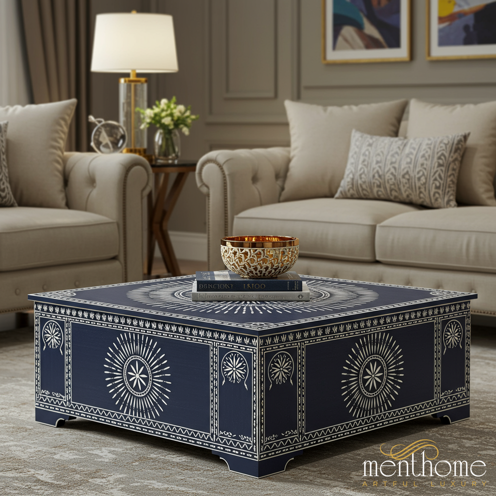 Elegant Navy Blue Hand-Painted Decorative Coffee Table | Luxury Handmade Coffee Table