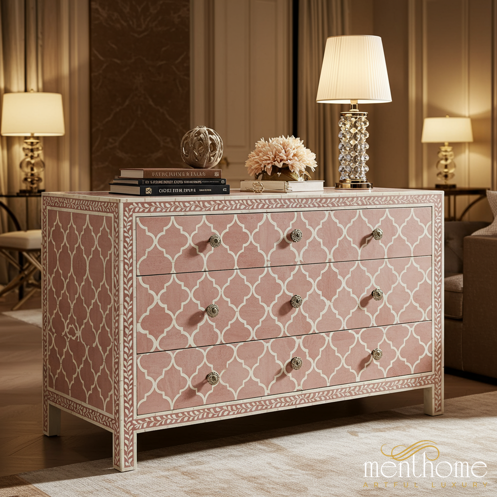 Elegant Pink Patterned 3-Drawer Chest | Luxury Handmade Dresser