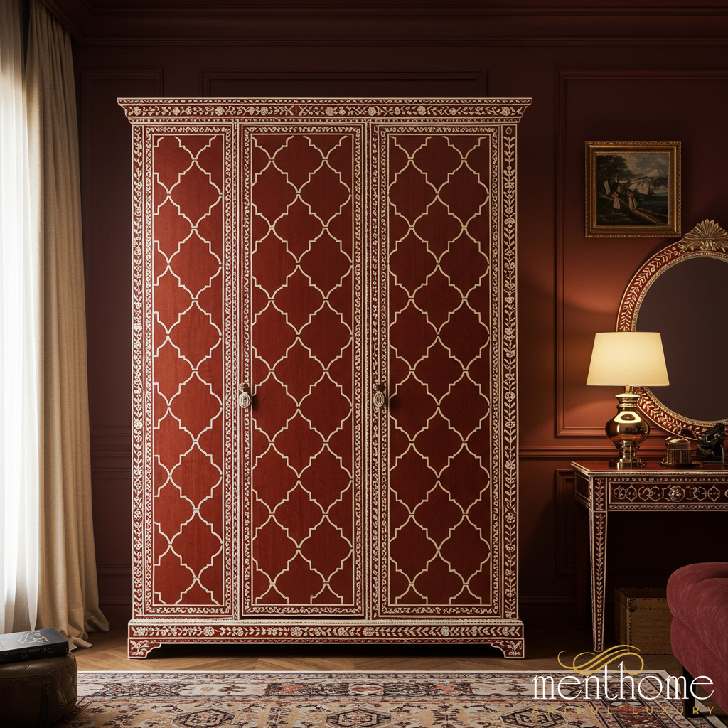 A stunning three-door wardrobe featuring intricate gold detailing on a rich red background, perfect for adding a touch of luxury and classic elegance to any bedroom or dressing area.