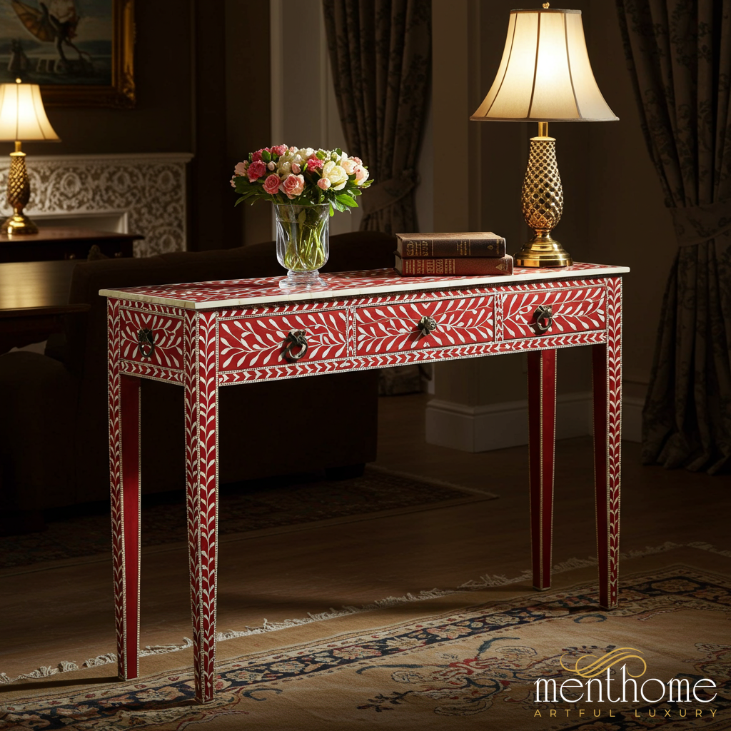 Elegant Red Leaf Pattern Wooden Console Table with Drawers | Luxury Handmade Console