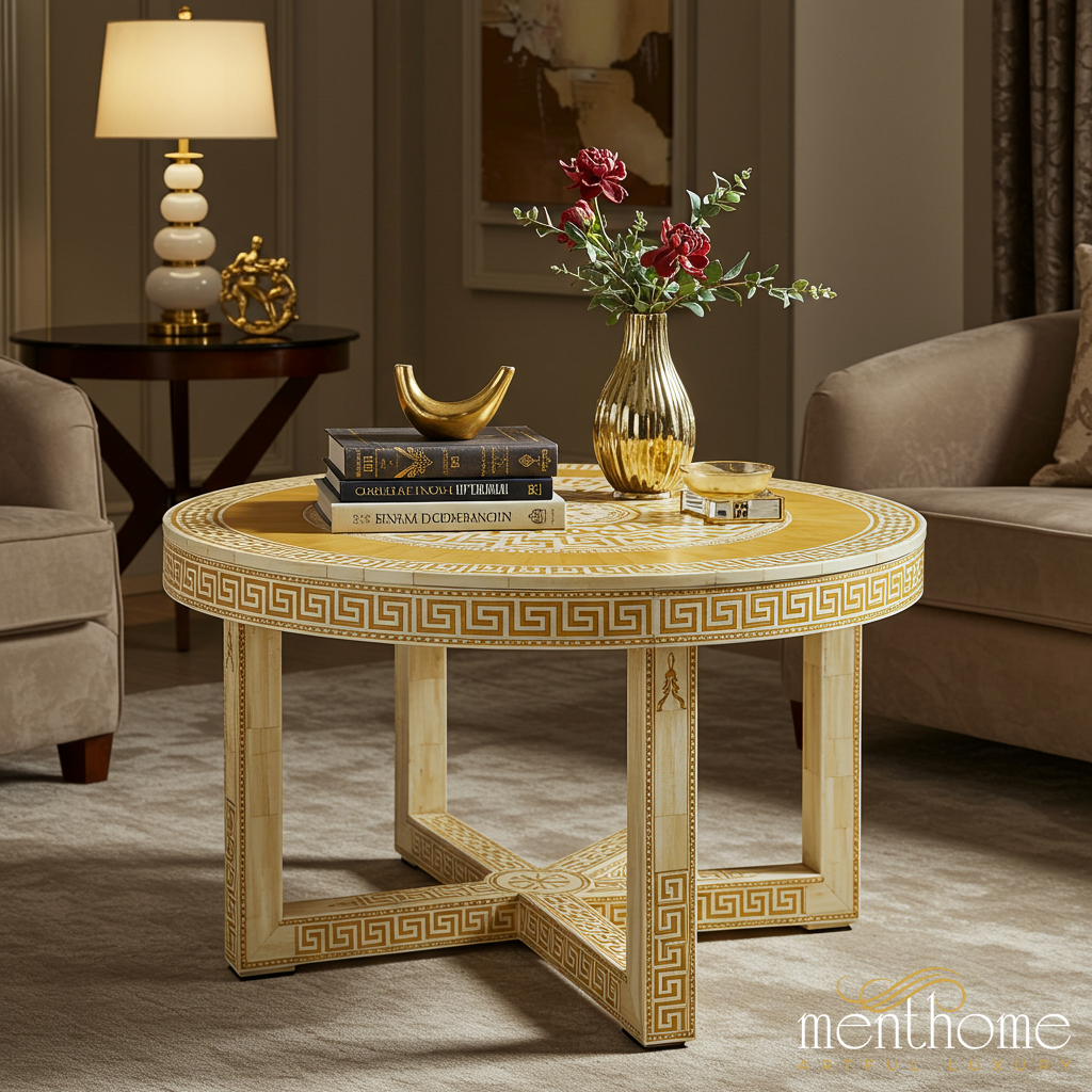 Elegant Round Coffee Table with Greek Key Inlay | Luxury Handmade Coffee Table