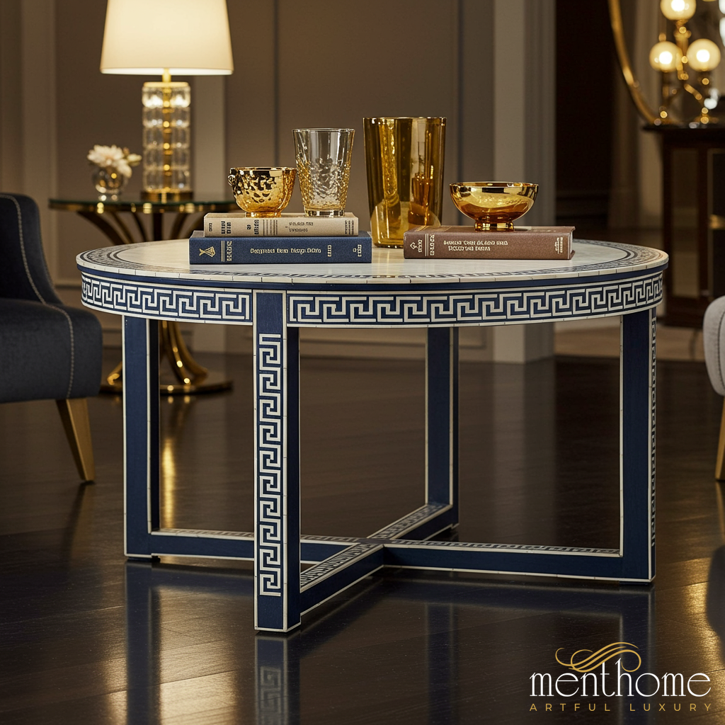 This elegant round coffee table features a stylish Greek key pattern along the edges and legs, combining classic design with modern craftsmanship. Its blue and white color scheme adds a sophisticated touch to any living room.