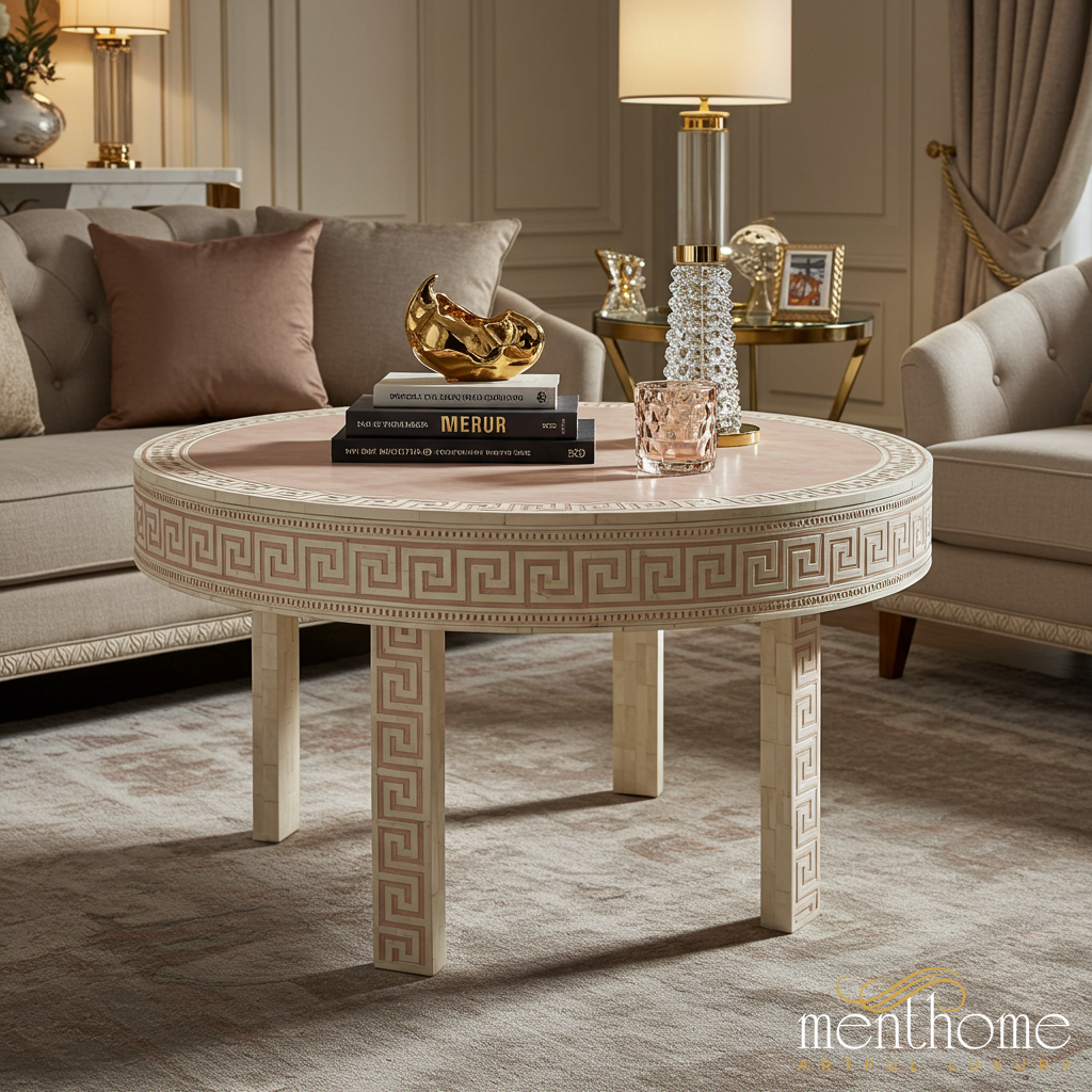 Elegant Round Wooden Coffee Table with Greek Key Pattern | Luxury Handmade Coffee Table