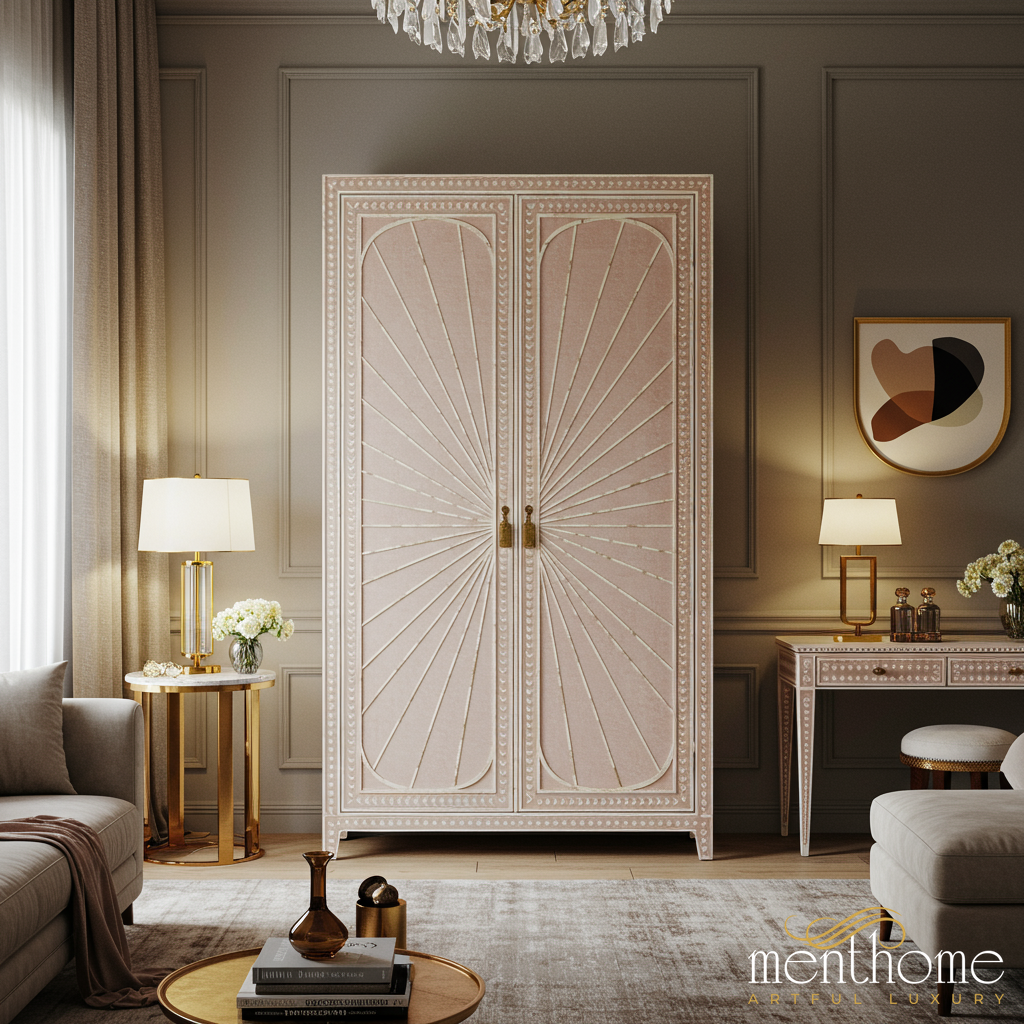 A sophisticated two-door wooden wardrobe featuring an elegant sunburst pattern design. This wardrobe combines classic craftsmanship with a modern pastel pink finish, accented by gold detailing and decorative studs, perfect for adding a stylish and functional focal point to any bedroom or living space.