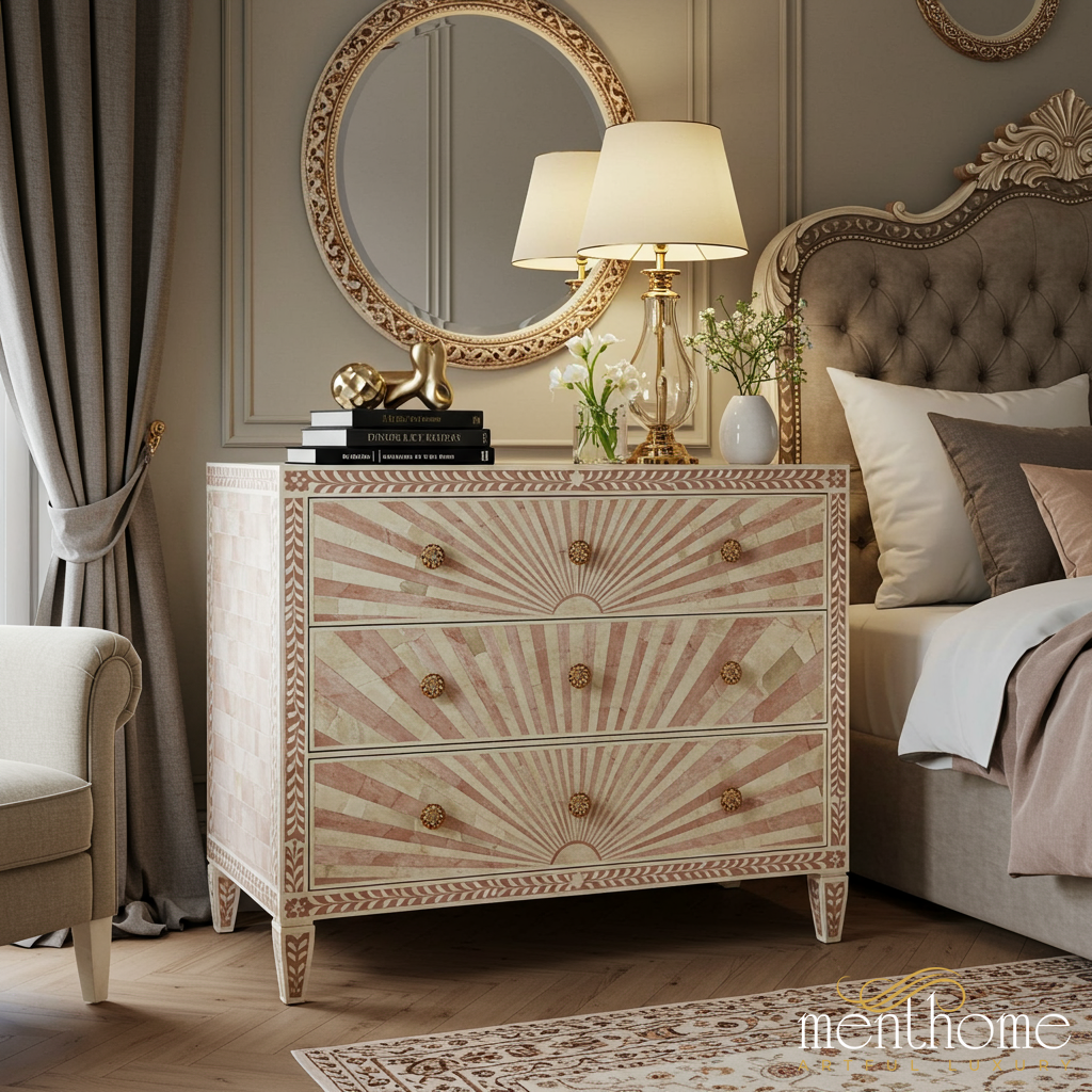 Elegant Sunburst Patterned Three-Drawer Dresser | Luxury Handmade Chest of Drawer
